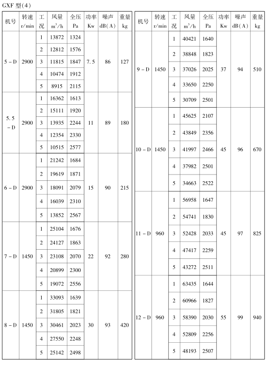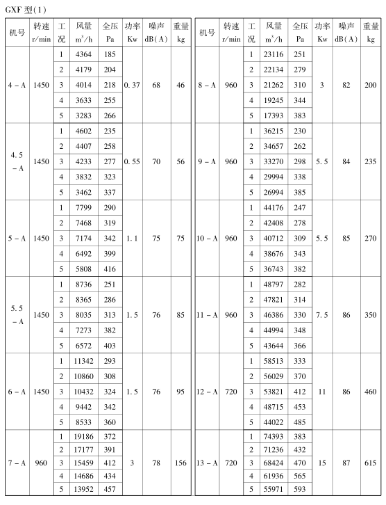 GXF系列斜流風(fēng)機(jī)按葉輪直徑分為400~1400mnm十四種規(guī)格,按類型分A、B、C、D、S五種類型,共五十八個機(jī)號。風(fēng)量由3000~90000m3/h,傘壓由185~2500pa;這樣就給設(shè)計(jì)和用戶單位提供了充分的選擇條件,具體數(shù)據(jù)請查風(fēng)機(jī)性能參數(shù)表。